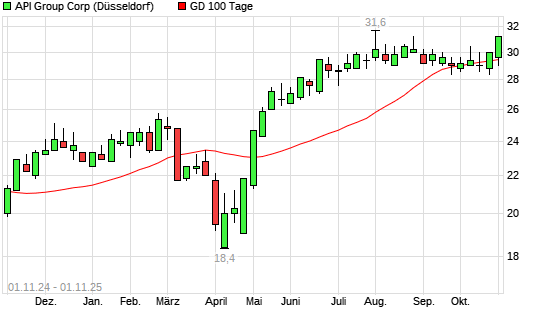 Mit dem Anstieg auf 30,00 EUR hat die API Group-Aktie am 31.10.2025 die 100-Tage-Linie nach oben gekreuzt.
