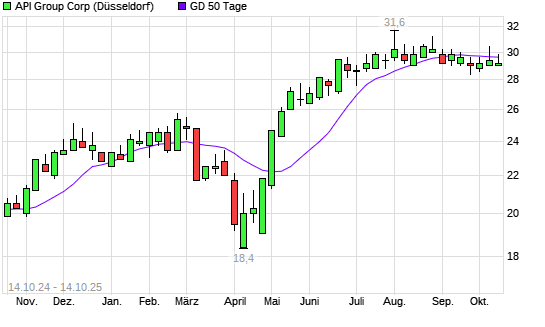 Mit dem Rücksetzer auf 29,40 EUR hat die API Group-Aktie am 13.10.2025 die 50-Tage-Linie nach unten gekreuzt.