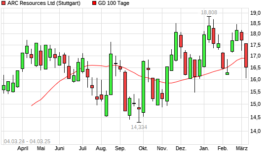 Mit dem Rücksetzer auf 16,53 EUR hat die ARC Resources-Aktie am 03.03.2025 die 100-Tage-Linie nach unten gekreuzt.