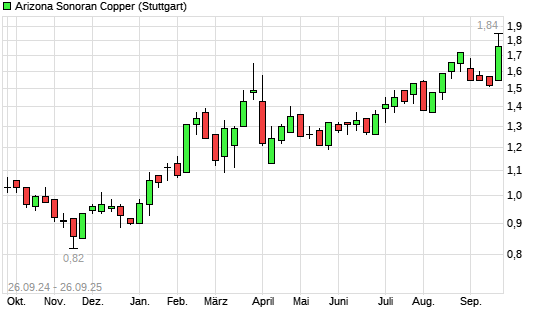 Mit dem Anstieg auf 1,75 EUR hat die ARIZONA SONORAN COPPER-Aktie (ISIN CA04058Q1054) am 25.09.2025 ein neues All-Time-High erreicht und damit den Kurs vom 28.03.2022 eingestellt.