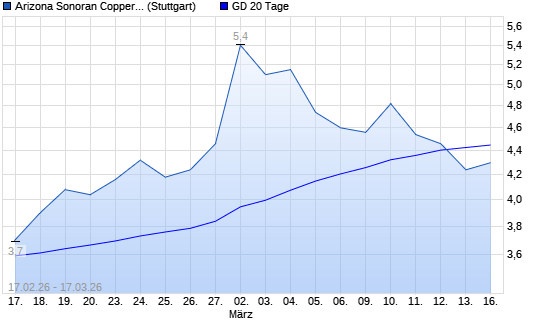 Mit dem Anstieg auf 4,54 EUR hat die ARIZONA SONORAN COPPER-Aktie am 16.03.2026 die 20-Tage-Linie nach oben gekreuzt. Der Abstand zur 200-Tage-Linie beträgt aktuell +89,05%.