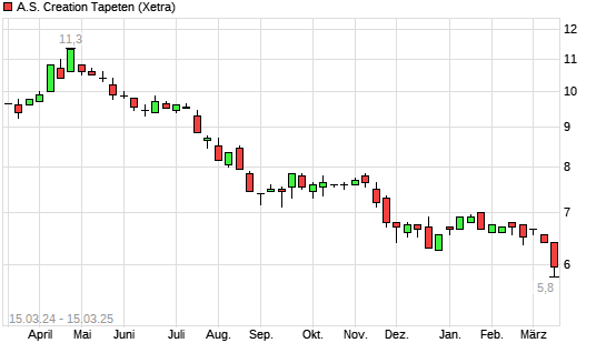 Mit dem Rücksetzer auf 5,65 EUR hat die A.S. Creation Tapeten-Aktie (ISIN DE000A1TNNN5) am 14.03.2025 ein neues All-Time-Low erreicht und damit den Kurs vom 13.03.2025 eingestellt.