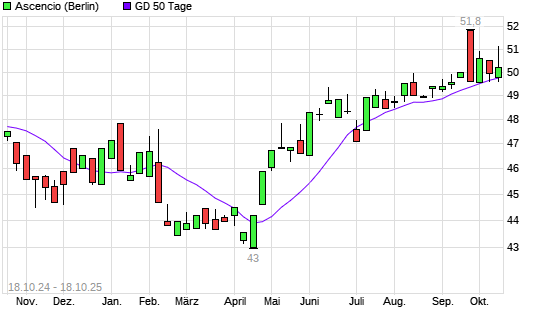 Mit dem Anstieg auf 50,20 EUR hat die ASCENCIO-Aktie am 17.10.2025 die 50-Tage-Linie nach oben gekreuzt.