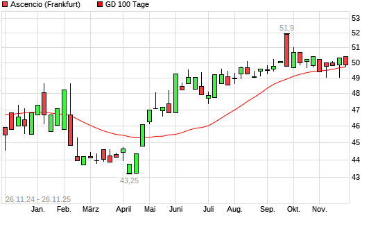 Mit dem Rücksetzer auf 49,70 EUR hat die ASCENCIO-Aktie am 25.11.2025 die 100-Tage-Linie nach unten gekreuzt.