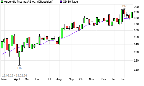 Mit dem Rücksetzer auf 181,00 EUR hat die ASCENDIS PH.SP.ADR 1 DK 1-Aktie am 17.02.2026 die 50-Tage-Linie nach unten gekreuzt.