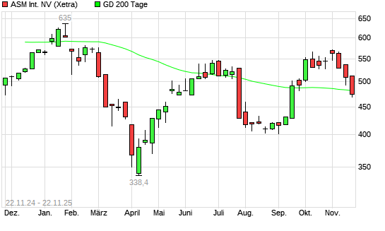 Mit dem Rücksetzer auf 468,30 EUR hat die ASM International-Aktie am 21.11.2025 die 200-Tage-Linie nach unten gekreuzt.