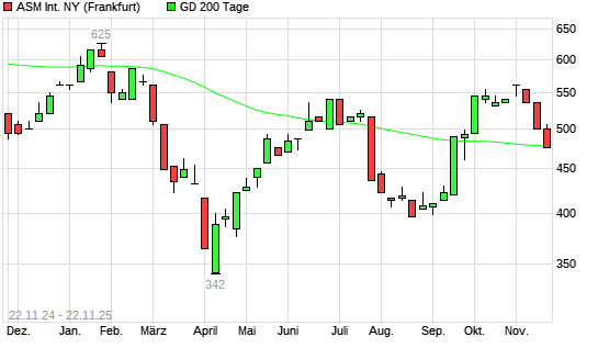 Mit dem Rücksetzer auf 470,00 EUR hat die ASM International-Aktie am 21.11.2025 die 200-Tage-Linie nach unten gekreuzt.