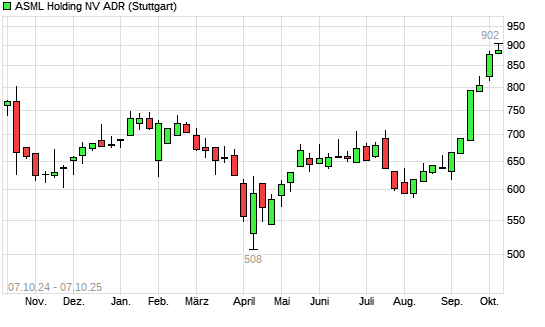 Mit dem Anstieg auf 892,00 EUR hat die ASML-Aktie (ISIN USN070592100) am 06.10.2025 ein neues 12-Monats-Hoch erreicht und damit den Kurs vom 03.10.2025 eingestellt.