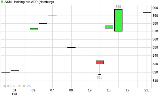 Mit dem Anstieg auf 904,00 EUR hat die ASML-Aktie (ISIN USN070592100) am 20.10.2025 ein neues 12-Monats-Hoch erreicht und damit den Kurs vom 06.10.2025 eingestellt.