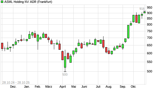 Mit dem Anstieg auf 908,00 EUR hat die ASML-Aktie (ISIN USN070592100) am 27.10.2025 ein neues 12-Monats-Hoch erreicht und damit den Kurs vom 20.10.2025 eingestellt.