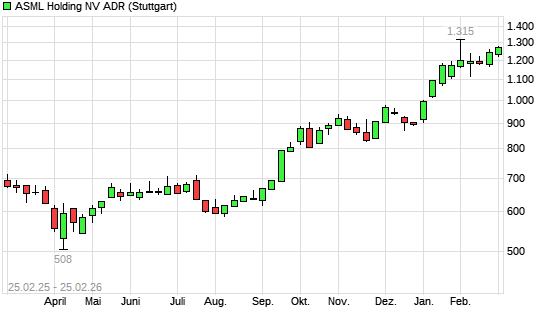 Mit dem Anstieg auf 1.270,00 EUR hat die ASML-Aktie (ISIN USN070592100) am 24.02.2026 ein neues All-Time-High erreicht und damit den Kurs vom 20.02.2026 eingestellt.