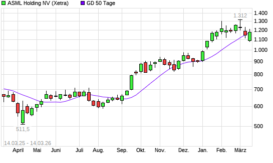 Mit dem Anstieg auf 1.175,40 EUR hat die ASML Holding-Aktie am 13.03.2026 die 50-Tage-Linie nach oben gekreuzt.