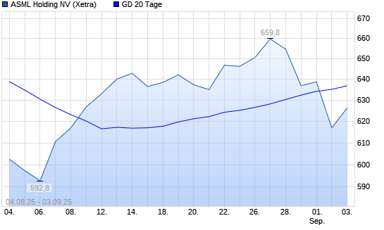 Mit dem Rücksetzer auf 620,30 EUR hat die ASML Holding-Aktie am 02.09.2025 die 20-Tage-Linie nach unten gekreuzt.