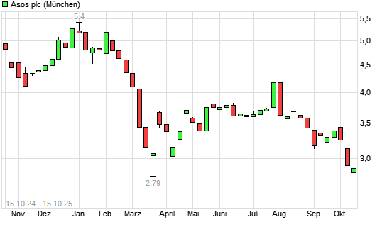 Mit dem Rücksetzer auf 2,64 EUR hat die ASOS-Aktie (ISIN GB0030927254) am 14.10.2025 ein neues 6-Monats-Tief erreicht und damit den Kurs vom 10.10.2025 eingestellt.