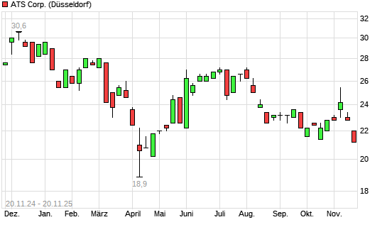 Mit dem Rücksetzer auf 21,40 EUR hat die ATS Automation-Aktie (ISIN CA00217Y1043) am 19.11.2025 ein neues 6-Monats-Tief erreicht und damit den Kurs vom 13.10.2025 eingestellt.