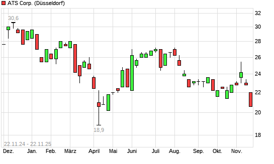 Mit dem Rücksetzer auf 20,80 EUR hat die ATS Automation-Aktie (ISIN CA00217Y1043) am 21.11.2025 ein neues 6-Monats-Tief erreicht und damit den Kurs vom 19.11.2025 eingestellt.