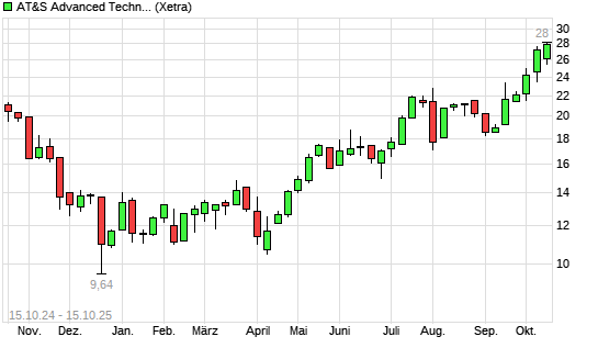Mit dem Anstieg auf 28,10 EUR hat die AT&S-Aktie (ISIN AT0000969985) am 14.10.2025 ein neues 12-Monats-Hoch erreicht und damit den Kurs vom 07.10.2025 eingestellt.