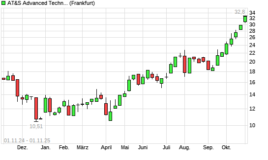 Mit dem Anstieg auf 32,80 EUR hat die AT&S-Aktie (ISIN AT0000969985) am 31.10.2025 ein neues 12-Monats-Hoch erreicht und damit den Kurs vom 27.10.2025 eingestellt.
