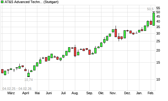Mit dem Anstieg auf 45,45 EUR hat die AT&S-Aktie (ISIN AT0000969985) am 03.02.2026 ein neues 3-Jahres-Hoch erreicht und damit den Kurs vom 02.02.2026 eingestellt.