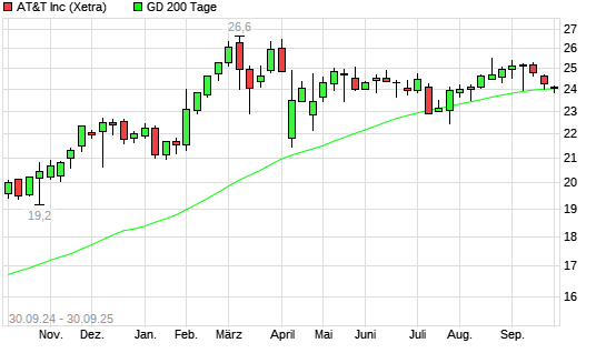 Mit dem Rücksetzer auf 23,99 EUR hat die AT&T-Aktie am 29.09.2025 die 200-Tage-Linie nach unten gekreuzt.