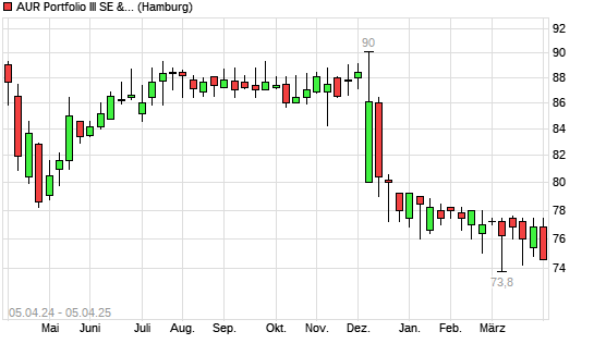 Mit dem Rücksetzer auf 74,60 EUR hat die AUR PORTFOLIO III SE-Aktie (ISIN DE000A40UTE1) am 04.04.2025 ein neues 12-Monats-Tief erreicht und damit den Kurs vom 04.03.2025 eingestellt.