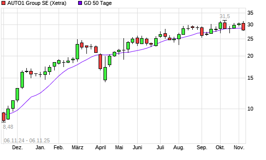 Mit dem Rücksetzer auf 28,12 EUR hat die AUTO1-Aktie am 05.11.2025 die 50-Tage-Linie nach unten gekreuzt.