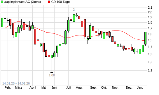Mit dem Rücksetzer auf 1,42 EUR hat die Aap Implantate-Aktie am 13.01.2026 die 100-Tage-Linie nach unten gekreuzt.