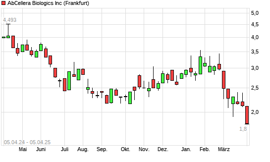 Mit dem Rücksetzer auf 1,86 EUR hat die AbCellera Biologics-Aktie (ISIN CA00288U1066) am 04.04.2025 ein neues All-Time-Low erreicht und damit den Kurs vom 03.04.2025 eingestellt.