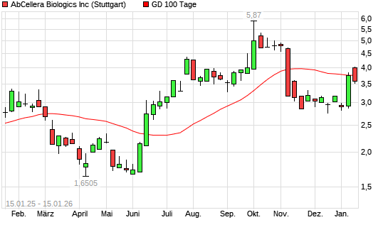 Mit dem Anstieg auf 3,84 EUR hat die AbCellera Biologics-Aktie am 14.01.2026 die 100-Tage-Linie nach oben gekreuzt.
