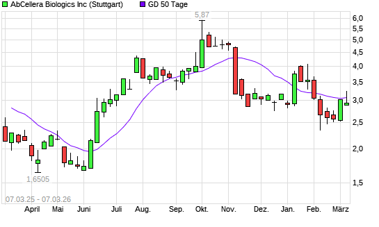 Mit dem Rücksetzer auf 3,01 EUR hat die AbCellera Biologics-Aktie am 06.03.2026 die 50-Tage-Linie nach unten gekreuzt.