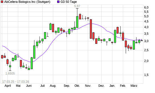 Mit dem Rücksetzer auf 3,05 EUR hat die AbCellera Biologics-Aktie am 16.03.2026 die 50-Tage-Linie nach unten gekreuzt.