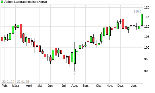 Mit dem Anstieg auf 113,32 EUR hat die Abbott-Aktie (ISIN US0028241000) am 22.01.2025 ein neues 12-Monats-Hoch erreicht und damit den Kurs vom 27.11.2024 eingestellt.