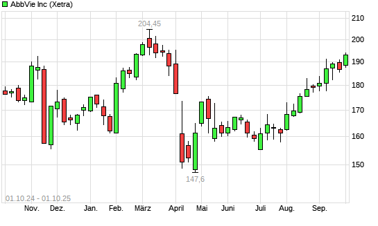 Mit dem Anstieg auf 195,40 EUR hat die Abbvie-Aktie (ISIN US00287Y1091) am 30.09.2025 ein neues 6-Monats-Hoch erreicht und damit den Kurs vom 31.03.2025 eingestellt.