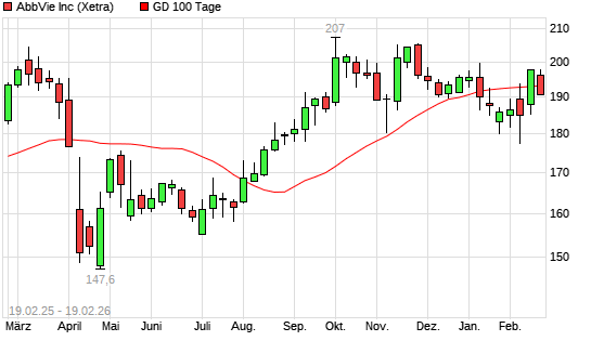 Mit dem Rücksetzer auf 192,80 EUR hat die Abbvie-Aktie am 18.02.2026 die 100-Tage-Linie nach unten gekreuzt.