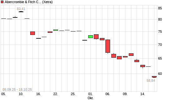 Mit dem Rücksetzer auf 58,82 EUR hat die Abercrombie & Fitch-Aktie (ISIN US0028962076) am 17.10.2025 ein neues 12-Monats-Tief erreicht und damit den Kurs vom 30.04.2025 eingestellt.