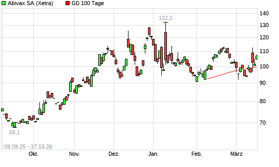 Mit dem Anstieg auf 103,80 EUR hat die Abivax-Aktie am 16.03.2026 die 100-Tage-Linie nach oben gekreuzt.