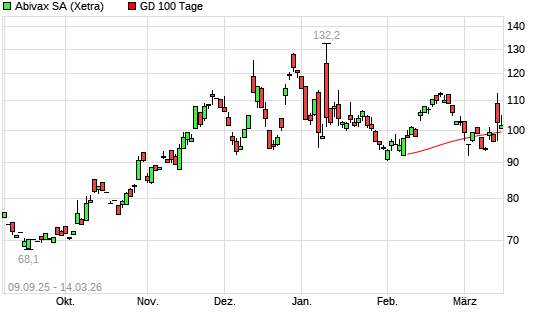 Mit dem Rücksetzer auf 100,40 EUR hat die Abivax-Aktie am 13.03.2026 die 100-Tage-Linie nach unten gekreuzt.