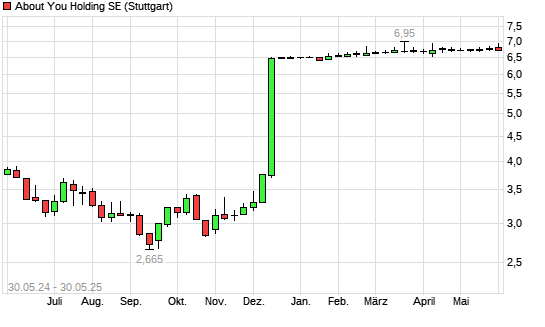Mit dem Anstieg auf 6,88 EUR hat die About You-Aktie (ISIN DE000A3CNK42) am 29.05.2025 ein neues 12-Monats-Hoch erreicht und damit den Kurs vom 13.03.2025 eingestellt.