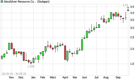 Mit dem Anstieg auf 4,30 EUR hat die Abrasilver Resource-Aktie (ISIN CA00379L3048) am 29.09.2025 ein neues All-Time-High erreicht und damit den Kurs vom 04.09.2025 eingestellt.