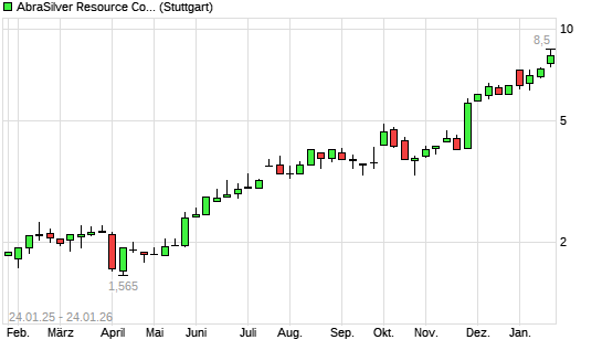 Mit dem Anstieg auf 8,40 EUR hat die Abrasilver Resource-Aktie (ISIN CA00379L3048) am 23.01.2026 ein neues All-Time-High erreicht und damit den Kurs vom 22.01.2026 eingestellt.