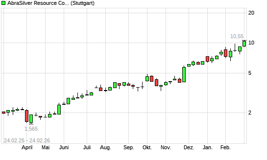 Mit dem Anstieg auf 10,00 EUR hat die Abrasilver Resource-Aktie (ISIN CA00379L3048) am 23.02.2026 ein neues All-Time-High erreicht und damit den Kurs vom 11.02.2026 eingestellt.