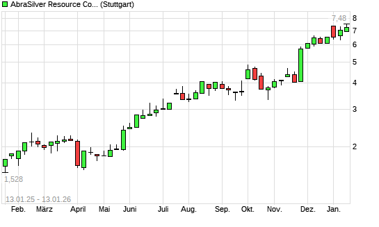 Mit dem Anstieg auf 7,46 EUR hat die Abrasilver Resource-Aktie (ISIN CA00379L3048) am 12.01.2026 ein neues All-Time-High erreicht und damit den Kurs vom 06.01.2026 eingestellt.Die Abrasilver ...weiterlesen