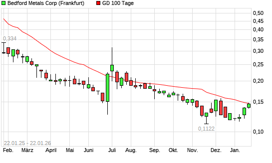 Mit dem Rücksetzer auf 0,14 EUR hat die Academy Metals-Aktie am 21.01.2026 die 100-Tage-Linie nach unten gekreuzt.Der Abstand zur 200-Tage-Linie beträgt aktuell -17,21%. ##trendBox## Die ...weiterlesen