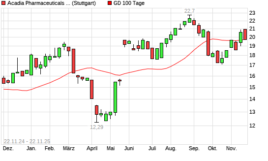 Mit dem Rücksetzer auf 19,71 EUR hat die Acadia Pharmaceuticals-Aktie am 21.11.2025 die 100-Tage-Linie nach unten gekreuzt.