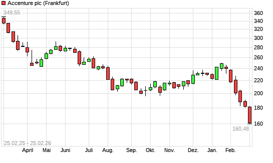 Mit dem Rücksetzer auf 167,32 EUR hat die Accenture-Aktie (ISIN IE00B4BNMY34) am 24.02.2026 ein neues 5-Jahres-Tief erreicht und damit den Kurs vom 23.02.2026 eingestellt.