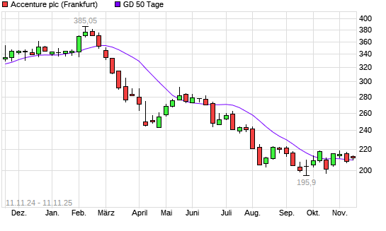 Mit dem Anstieg auf 210,40 EUR hat die Accenture-Aktie am 10.11.2025 die 50-Tage-Linie nach oben gekreuzt.