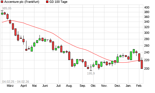 Mit dem Rücksetzer auf 202,25 EUR hat die Accenture-Aktie am 03.02.2026 die 100-Tage-Linie nach unten gekreuzt.