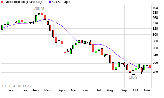 Mit dem Rücksetzer auf 209,10 EUR hat die Accenture-Aktie am 06.11.2025 die 50-Tage-Linie nach unten gekreuzt.
