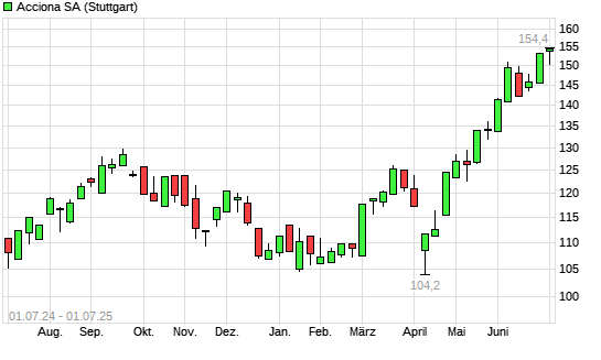 Mit dem Anstieg auf 153,80 EUR hat die Acciona-Aktie (ISIN ES0125220311) am 30.06.2025 ein neues 12-Monats-Hoch erreicht und damit den Kurs vom 25.06.2025 eingestellt.
