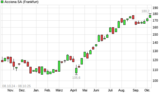 Mit dem Anstieg auf 180,20 EUR hat die Acciona-Aktie (ISIN ES0125220311) am 07.10.2025 ein neues 12-Monats-Hoch erreicht und damit den Kurs vom 25.08.2025 eingestellt.